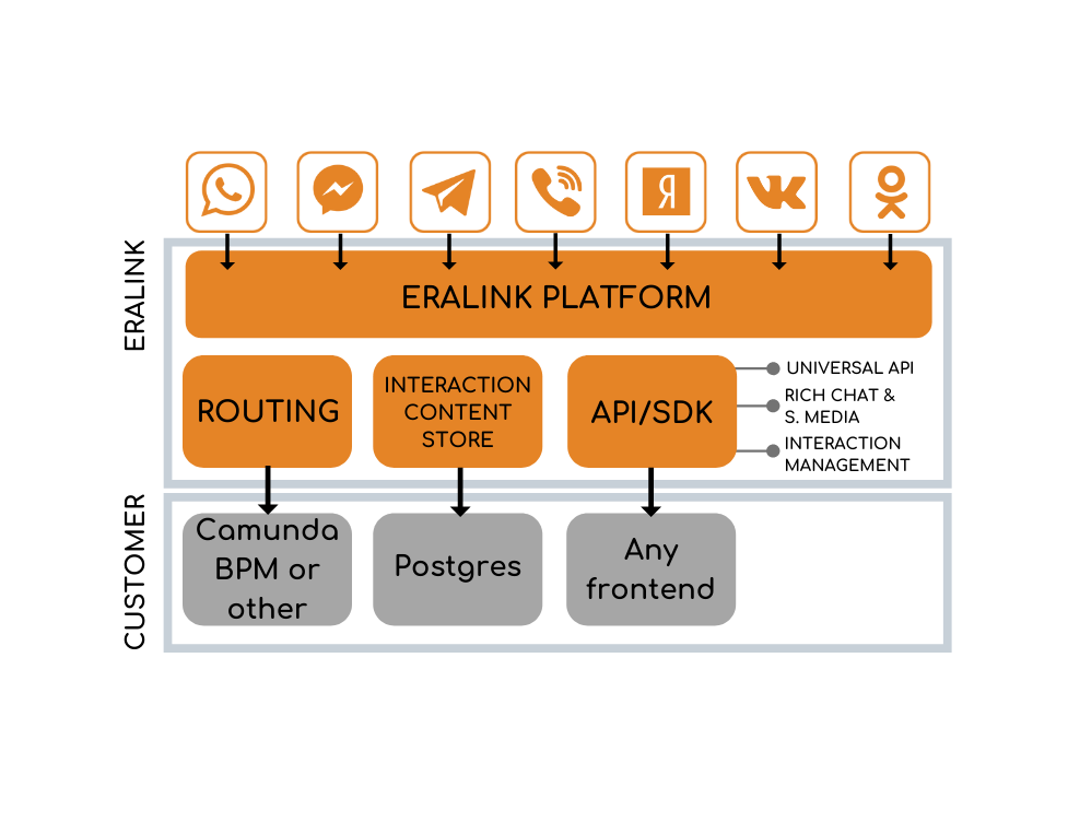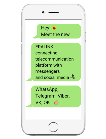 ERALINK provides to quickly connect such channels as Telegram, Viber, WhatsApp, VK, OK and various chat bots to any telecom platform via unified SDK.